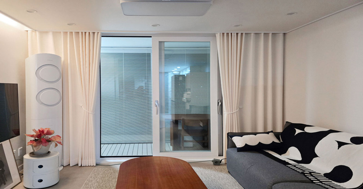 여성 디자이너 실장님께서 방문하셔서 겉지만 원한다고 말씀드리니, 심플하면서도 내추럴한 느낌을 살릴 수 있도록 얇지 않은 린넨 커튼으로 겨울엔 따뜻하고 여름엔 자연스럽게 어우러지는 소재라 사계절에 다 잘 어울린다고 추천주셨어요 . 거실 베란다와 방에는 알루미늄 블라인드를 설치하고, 거실 창에는 린넨 커튼을 사용해 깔끔하고 세련된 분위기를 연출되었네요. 제가 원하던 느낌이 그대로 표현되어 너무 기쁩니다! 감사합니다. 주변에도 많이 추천드릴게요!