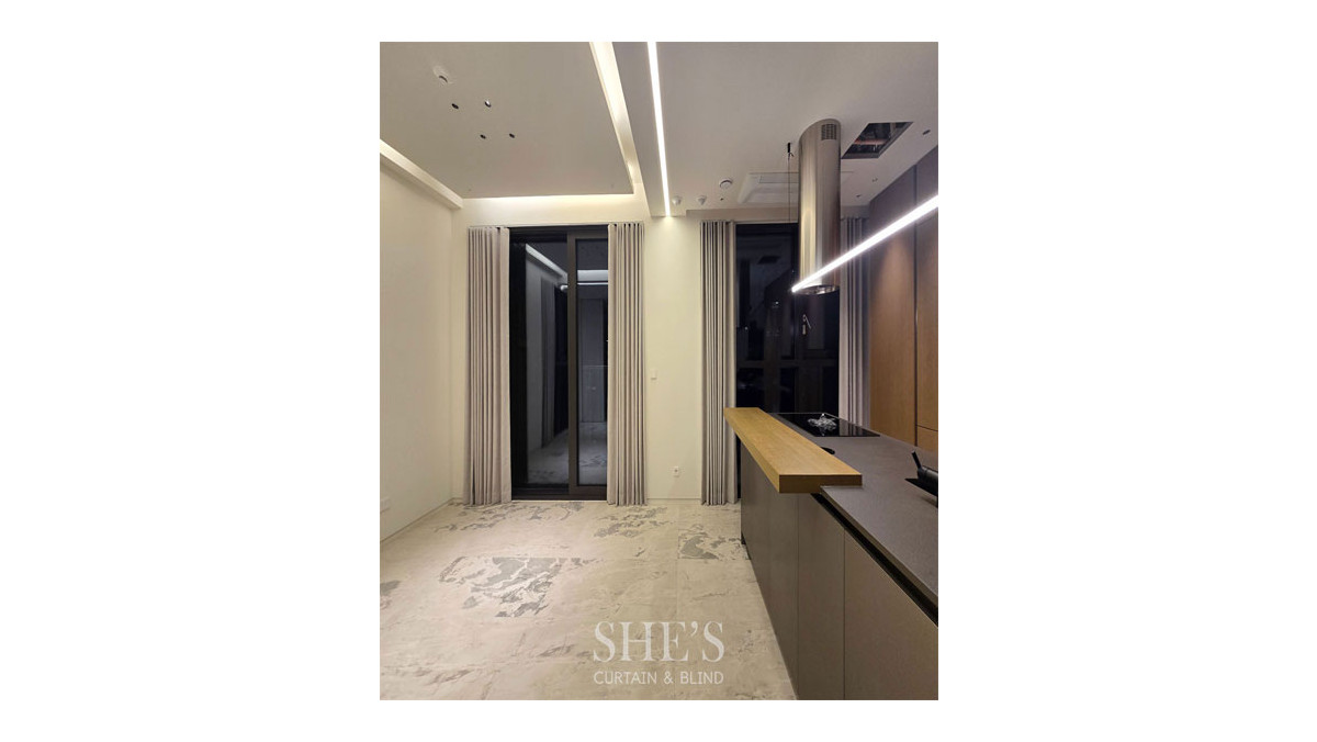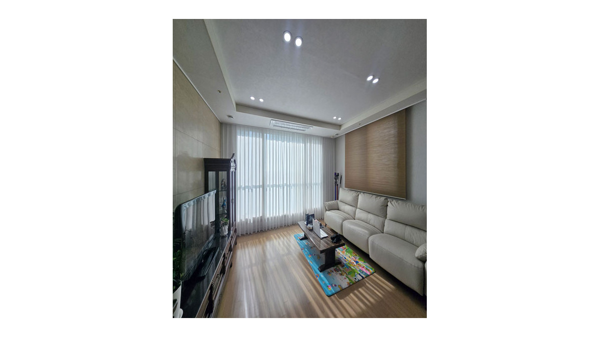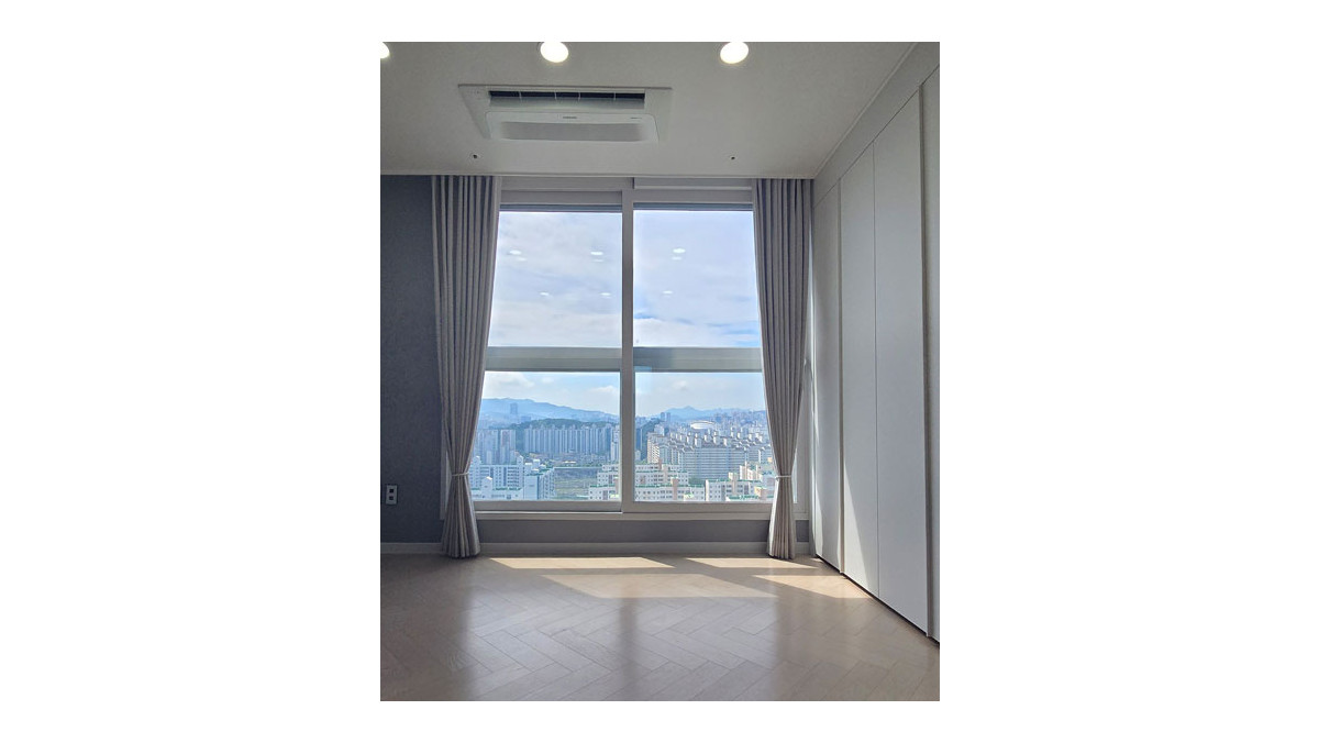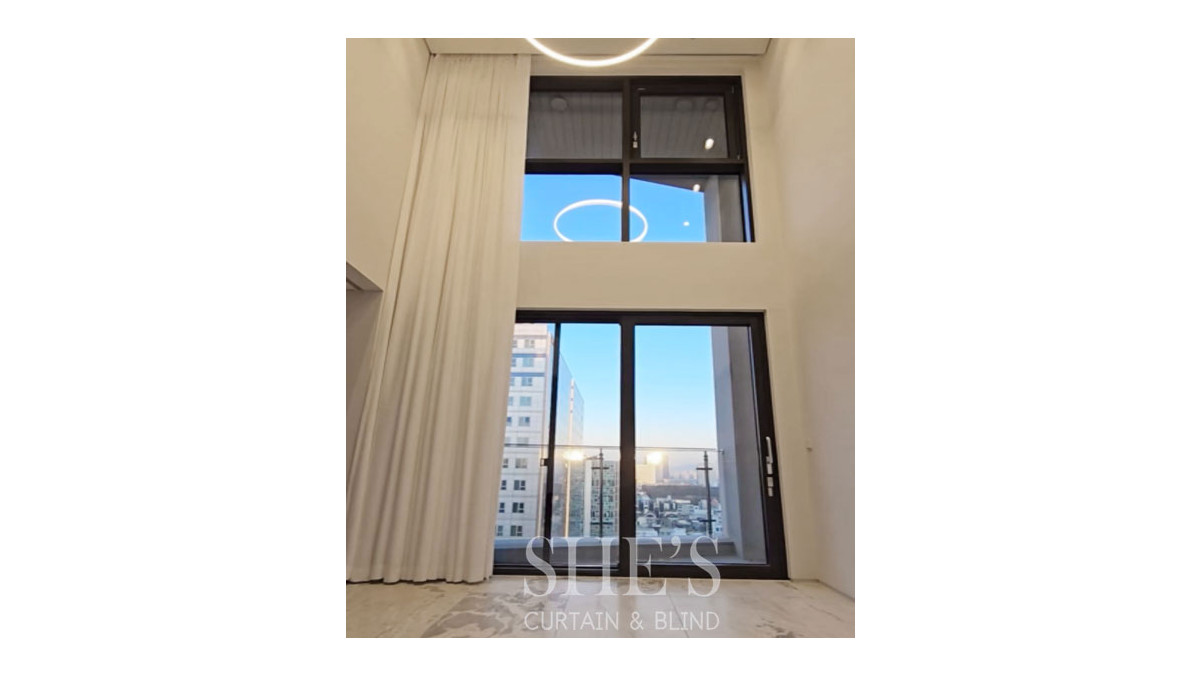 고층에서 강한 햇빛을 효과적으로 차단하기 위해 암막커튼과 쉬폰커튼을 이중으로 시공
