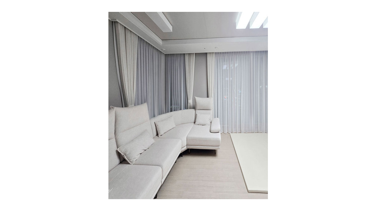 화이트 인테리어에 오트밀 컬러 린넨 커튼은 부드럽고 아늑한 분위기를 연출하며, 은은한 채광과 세련된 미니멀리즘을 완성합니다.